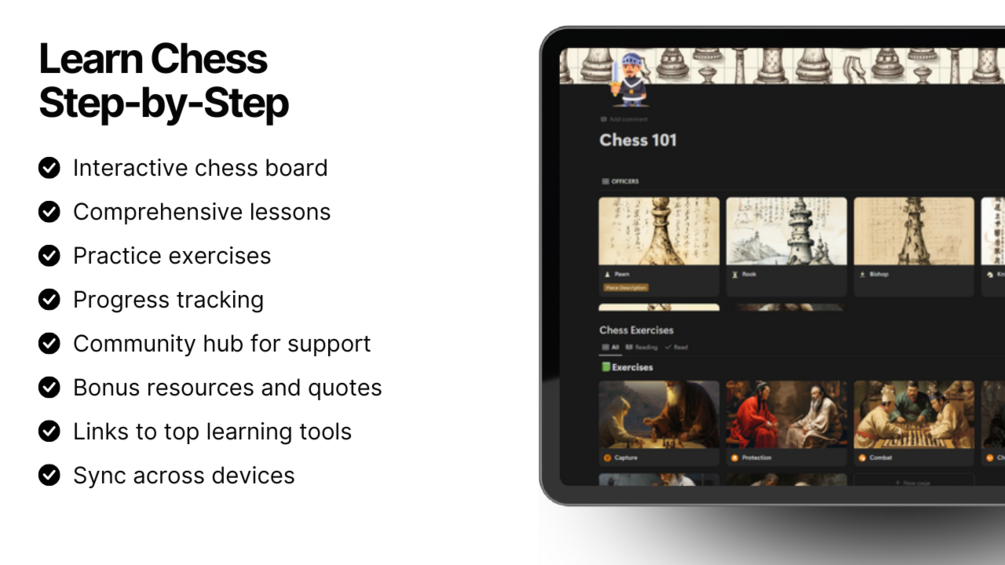 This Notion template is designed to make learning chess simple and enjoyable. With interactive tools and resources, you can build a strong foundation in chess, track your progress, and stay motivated on your journey.