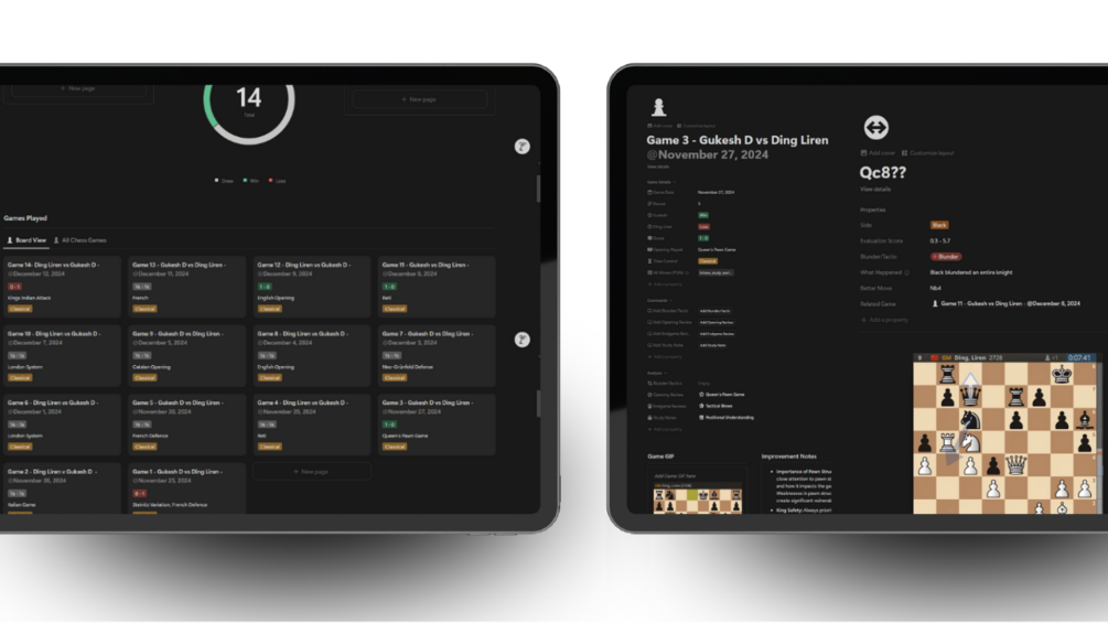 Step into the minds of the world’s best chess players with this comprehensive Notion template! Designed around the historic 2024 World Chess Championship between Ding Liren and Gukesh D, this template provides in-depth analysis of every game played during the match.